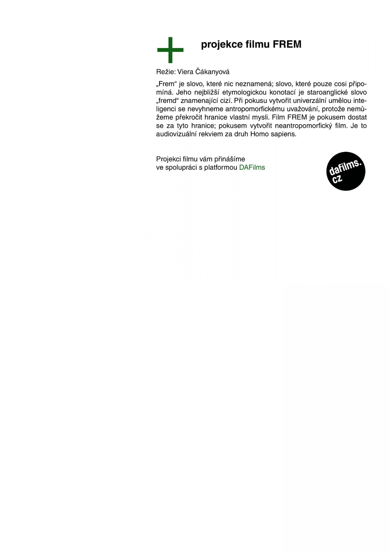 Všem divákům online PechaKucha bude ve spolupráci s portálem dafilms.cz po skončení hlavního programu nabídnuta možnost zhlédnout filmový projekt FREM režisérky Viery Čákanyové, ve kterém se umělá inteligence stává pozorovatelem aktuálního přírodního ekosystému Antarktidy. Vstupenky jsou v prodeji v síti GoOut.net a na webu mojekinolive.cz