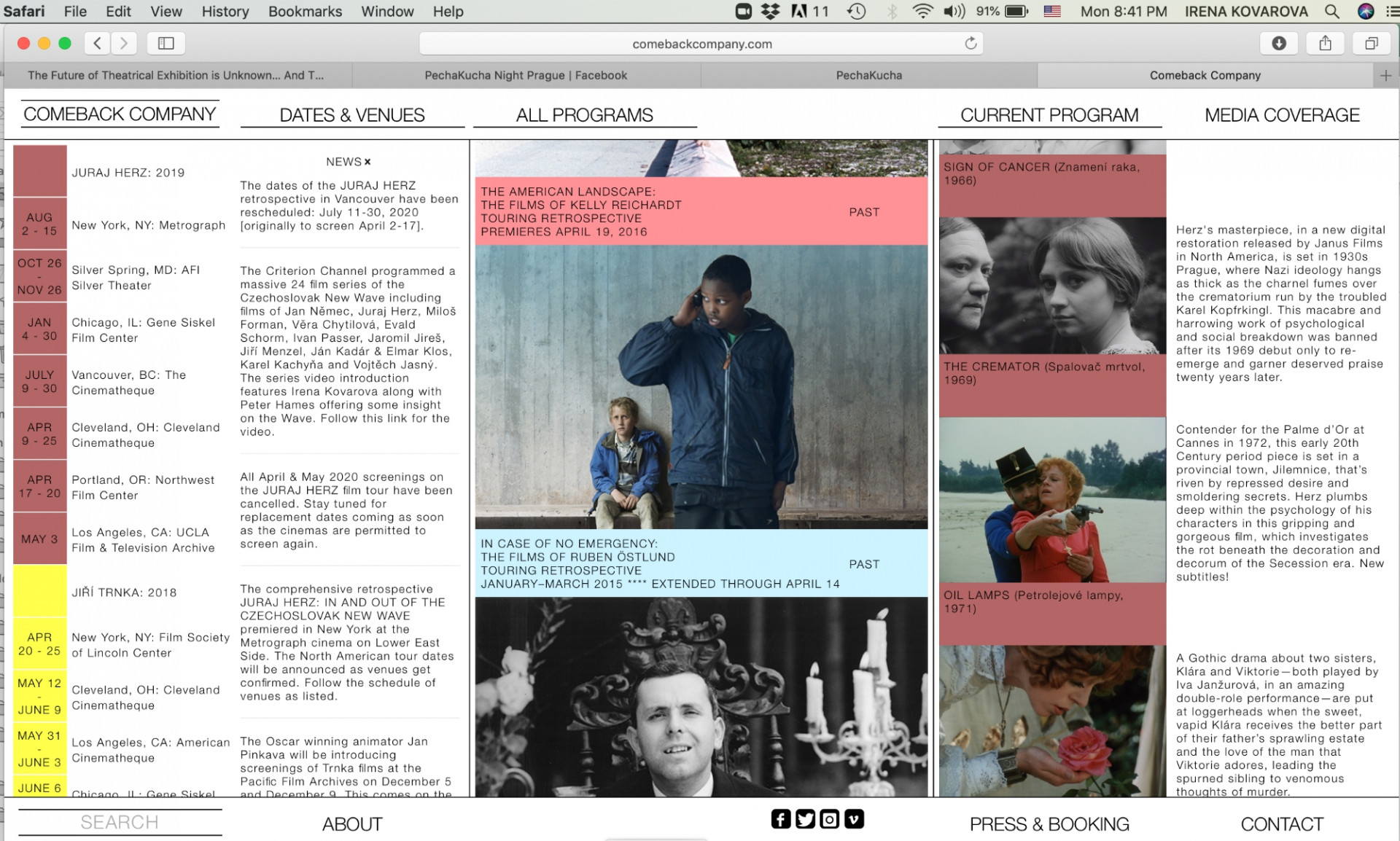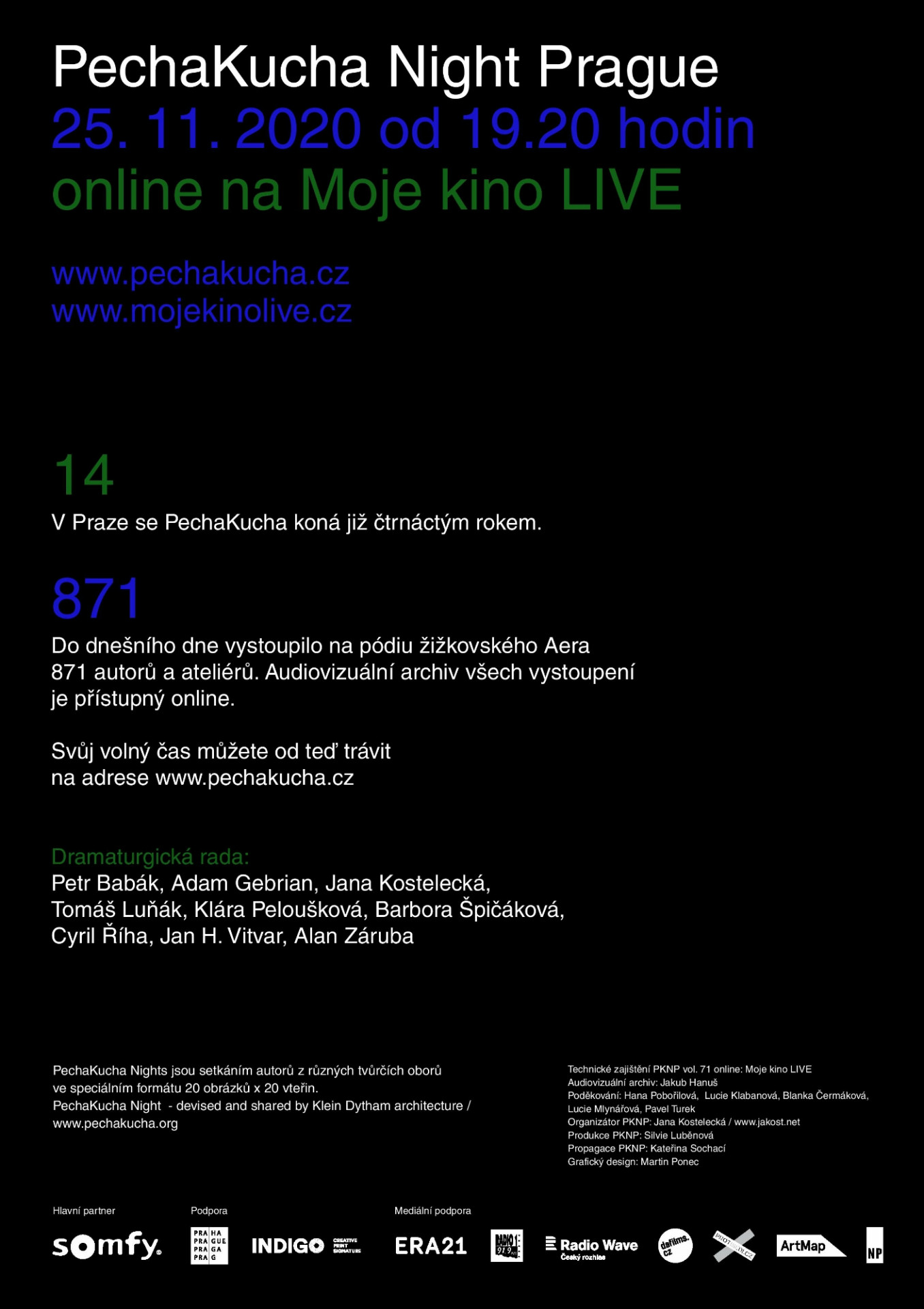 Ve středu 25. listopadu se koná již 71. večer PechaKucha Night Prague, který skrze platformu Moje kino LIVE představí dvanáct mluvčích z různých koutů světa. Organizátoři pražské PechaKucha, která se koná již od roku 2007, využijí online formát jako možnost představit hosty, kteří by se naživo zúčastnit nemohli. Během jednoho večera se tak skrze živý přenos připojí a představí sebe a svou práci čeští autoři žijící a působící v New Yorku, Berkeley, Londýně, Amsterdamu, Miláně, Wrocławi, Budapešti či Montrealu.