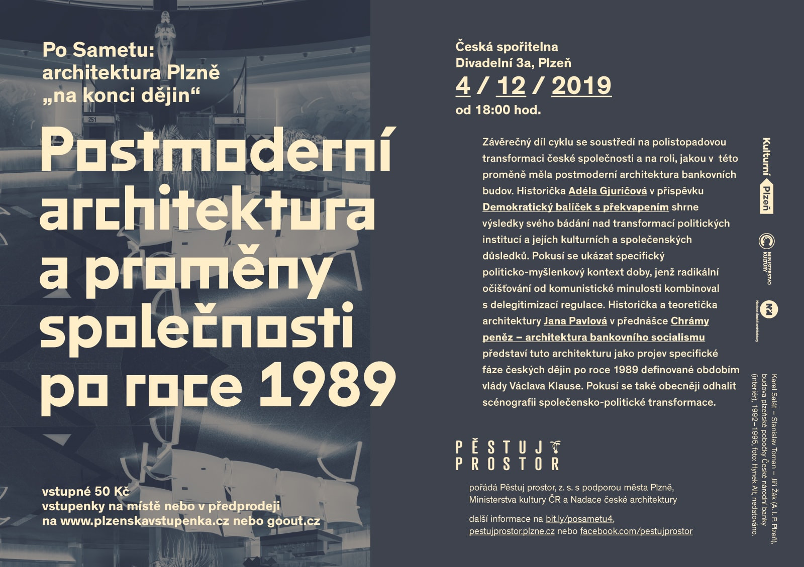 Přednášková série Po Sametu: architektura Plzně „na konci dějin“ se uzavře čtvrtým dílem ve středu 4. prosince 2019 v administrativní budově s regionálním korporátním centrem České spořitelny v Divadelní ulici v Plzni. Historička Adéla Gjuričová z Ústavu pro soudobé dějiny AV ČR i historička a teoretička architektury Jana Pavlová, která v loňském i letošním roce patřila mezi kurátorky progresivní pražské Galerie VI PER, se v něm soustředí na společenský a politický rozměr polistopadové transformace společnosti a na roli, jakou v této proměně měla postmoderní architektura bankovních budov.