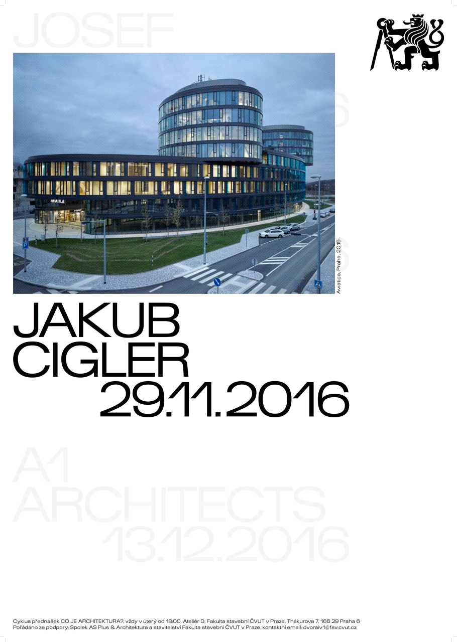 Jakub Cigler bude třetím přednášejícím, jež představí svojí vizi architektury z pozice mezinárodně uznávaného architekta, který realizuje se svým ateliérem i celé komplexy staveb, jako např. Quadrio na Národní třídě nebo revitalizaci Moskevské ulice ve Vršovicích. Jedním z hlavních témat architekta Ciglera je veřejný prostor, na který klade velký důraz při realizaci svých projektů.