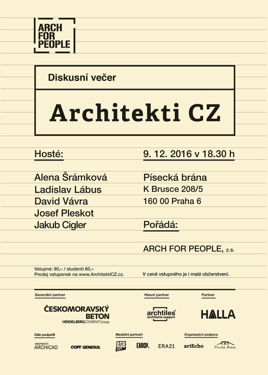 V pátek 9. prosince 2016 se v Praze v Písecké bráně koná sedmá debata Architekti CZ za účasti Aleny Šrámkové, Ladislava Lábuse, Josefa Pleskota, Davida Vávry a Jakuba Ciglera. Bude se mluvit zejména o tom, zdali je architektura víc umění, nebo řemeslo, bude se také vzpomínat.
