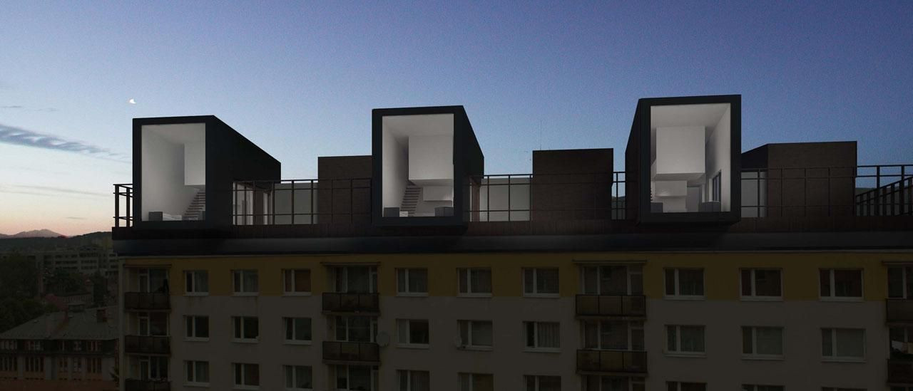 „Vítězný návrh autorů Zuzany Retterové a Bořka Němce je studentsky hravý. Autoři se inspirovali karavany a navrhli nezávislé kontejnery na kolečkách. Zajímavá je jejich charakteristika samotných klientů: „singles, kteří chtějí být sami, ale ne osamělí. Singles se nechtějí příliš podřizovat. Touží žít podle svého. Jejich život je nestále v pohybu…“. Přesně tak působí i jejich návrh. Na upravené střeše panelového domu je umístěno 10 barevných boxíků (7 obytných a 3 společné). Dispozice jednotlivých boxíků připomínají kajuty či obytné přívěsy – prostor je maximálně využit. Společné boxíky představují kavárnu, kino a prádelnu,“ uvedla Dana Matějovská, vedoucí kabinetu MOLAB FA ČVUT.