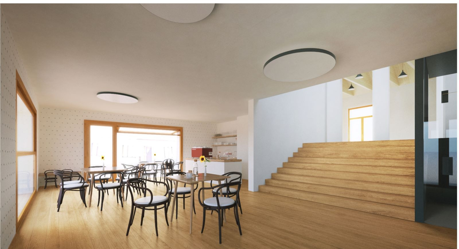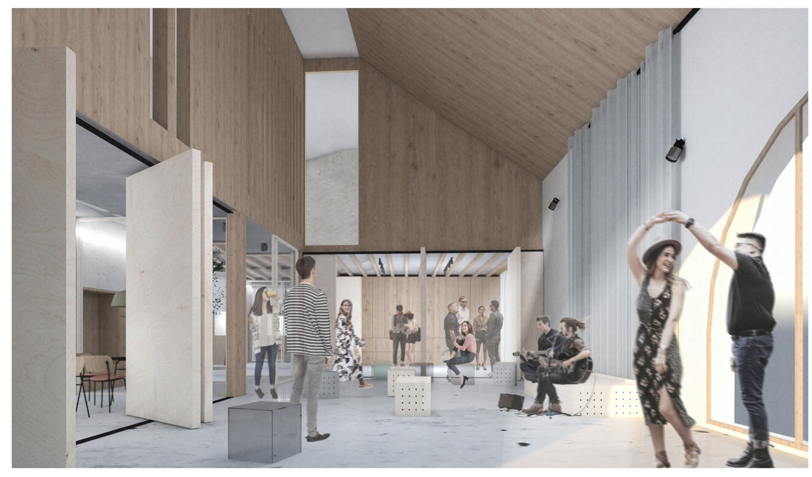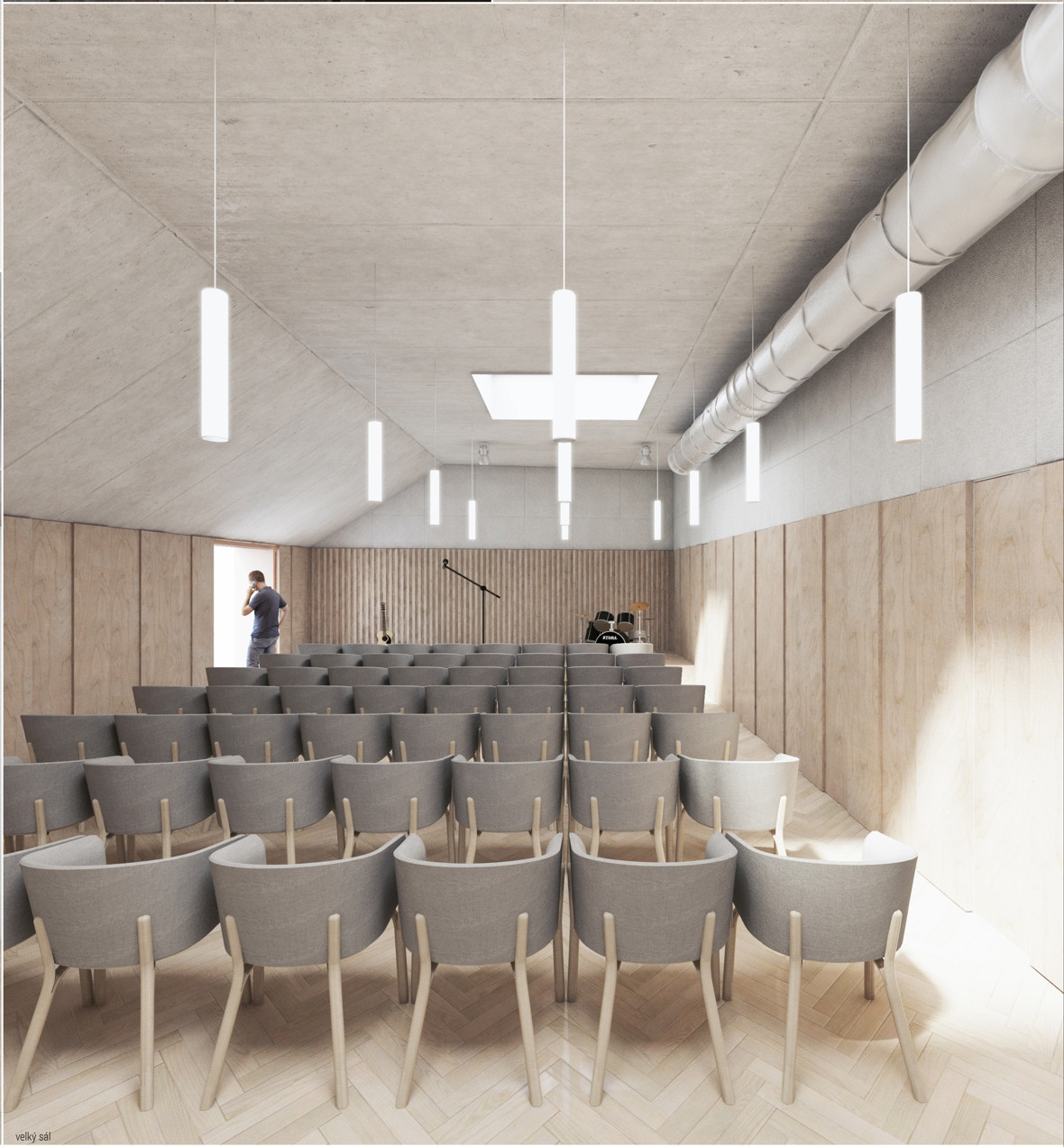 Hlavní vnitřní prostory se potkávají na prostorném schodišti s horním osvětlením, které je spojujícím prvkem celé dispozice. Výškový rozdíl jednotlivých úrovní je vždy jen půl patra, takže jsou sál, foyer s kavárnou i klubovny vzájemně dobře dostupné. Naproti tomu jsou všechny prostory vybaveny systémem posuvných stěn, které umožní nerušený souběh více různých aktivit současně.