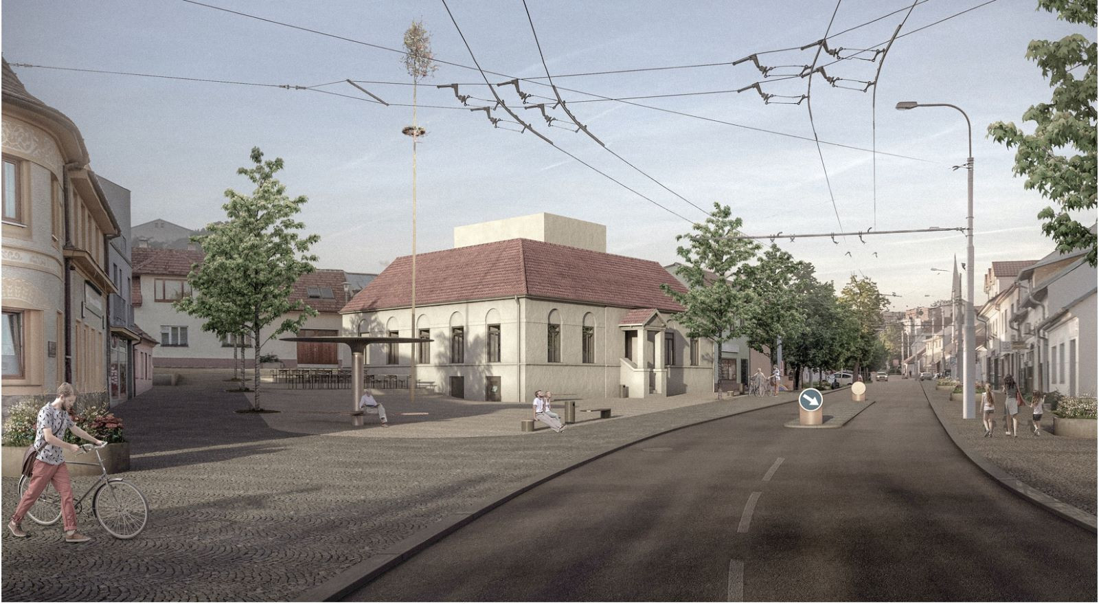 Vítězný návrh zachovává původní budovu, které dává nový nádech. Autoři počítají se zateplením fasád či novými dřevěnými krovy. Uvnitř je dům zredukován na nosnou konstrukci tak, aby do něj bylo možné umístit sál pro sto lidí. Původní objekt doplňují architekti o novou přístavbu v podobě jedenáct metrů vysoké věže, která bude sloužit pro potřeby kluboven. Upravují také přilehlé náměstíčko, kde bude možné pořádání hodů, vánočních trhů a dalších akcí v obci. Součástí jsou i nové trolejbusové zastávky s otočnou lavicí.