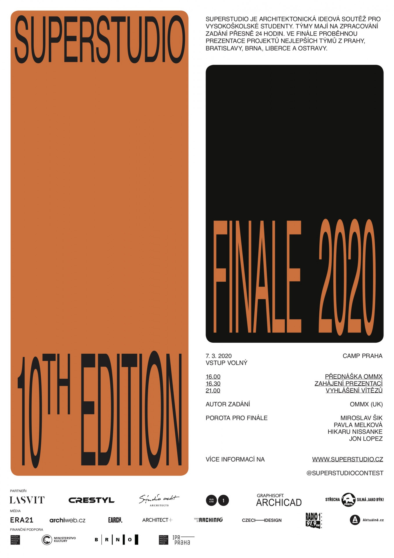 V sobotu 7. března proběhne v pražském Centru architektury a městského plánování CAMP finálový večer jubilejního 10. ročníku architektonické soutěže pro studenty vysokých škol SUPERSTUDIO. Studenti z celého Česka a Slovenska představí svá řešení zadání, které vypracovalo úspěšné londýnské studio OMMX. Zakladatele studia v porotě doplní mezinárodně uznávaný česko-švýcarský architekt Miroslav Šik a architekta a teoretička Pavla Melková. Finálový večer je přístupný veřejnosti.