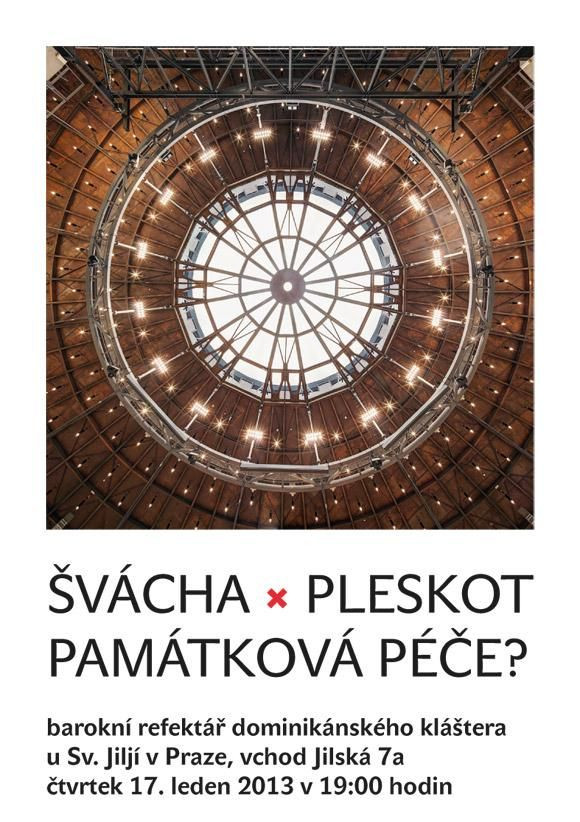 Jsou památkáři škůdci brzdící jakýkoli zdravý rozvoj, apoštolové průměrnosti, nebo naopak světci (byť možná jurodiví), kteří jako jedni z mála stráží základní západní hodnoty, od kterých se většinová společnost podle mnohých odvrací? A jsou opravdu všechny nové zásahy do starých zdí tak kongeniální? Nejsou architekti jen falešnými proroky pokroku, kteří tvrdohlavě prosazují vlastní vize? Kdo je advokát budoucnosti? Je tak jasné, co je vlastně předmětem památkové péče? Vítězí v současném pojetí oboru duch nad hmotou, nebo hmota nad duchem? Je uchování matérie spolehlivým či dokonce jediným nositelem paměti, kritériem přetrvání a tím i branou budoucího života? Kde začíná a kde končí kompetence památkové péče? Kam až sahá právo majitele památku přetvořit? Jak památkovou péči, která se dotýká života nás všech, dnes nově chápat? K debatnímu stolu nad nelehkými otázkami usednou u dominikánů, v budově, kterou samotnou brzy čeká zásadní proměna, dva muži, kteří téma promýšlejí – byť každý z jiného úhlu pohledu – po celý svůj život: Prof. Rostislav Švácha a architekt Josef Pleskot. Debatu moderuje Norbert Schmidt.