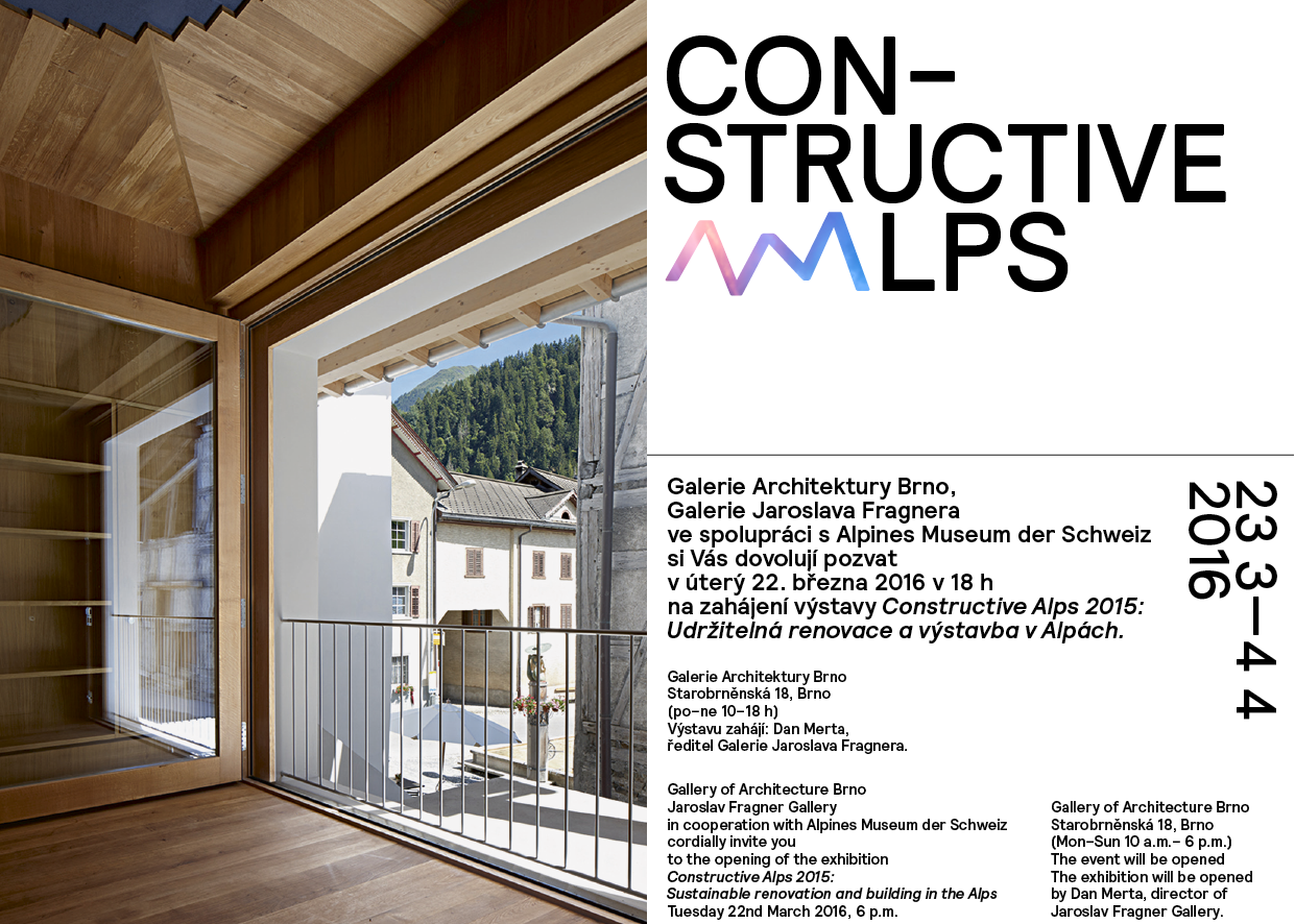 Galerie Architektury Brno a Galerie Jaroslava Fragnera ve spolupráci s Centrem architektury uvádí výstavy věnované švýcarské horské moderní architektuře pod názvem POSTAVENO V HORÁCH / NOVÉ STAVBY VE ŠVÝCARSKÝCH HORÁCH - CONSTRUCTIVE ALPS / BUILT IN SWISS MOUNTAINS.
