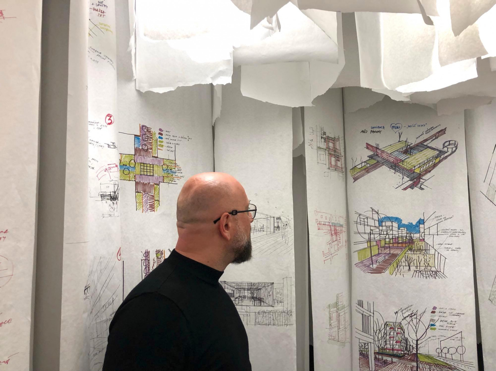 Nejde jen o jeho vizuální podobu, ale o okolnosti, které k němu patří. Skici jsou prezentovány na pruzích autentického „šmíráku“ který šustí v průvanu, voní tu čerstvě ořezané pastelky. V pozadí se ozývá zvuk tužky skicující na papír: „Zhmotnili jsme ty mraky práce tisícem a třemi sty pruhy skicovacího papíru se stovkami kreseb do podoby mraku. A trochu jízlivě jsme je nazvali CLOUD.“