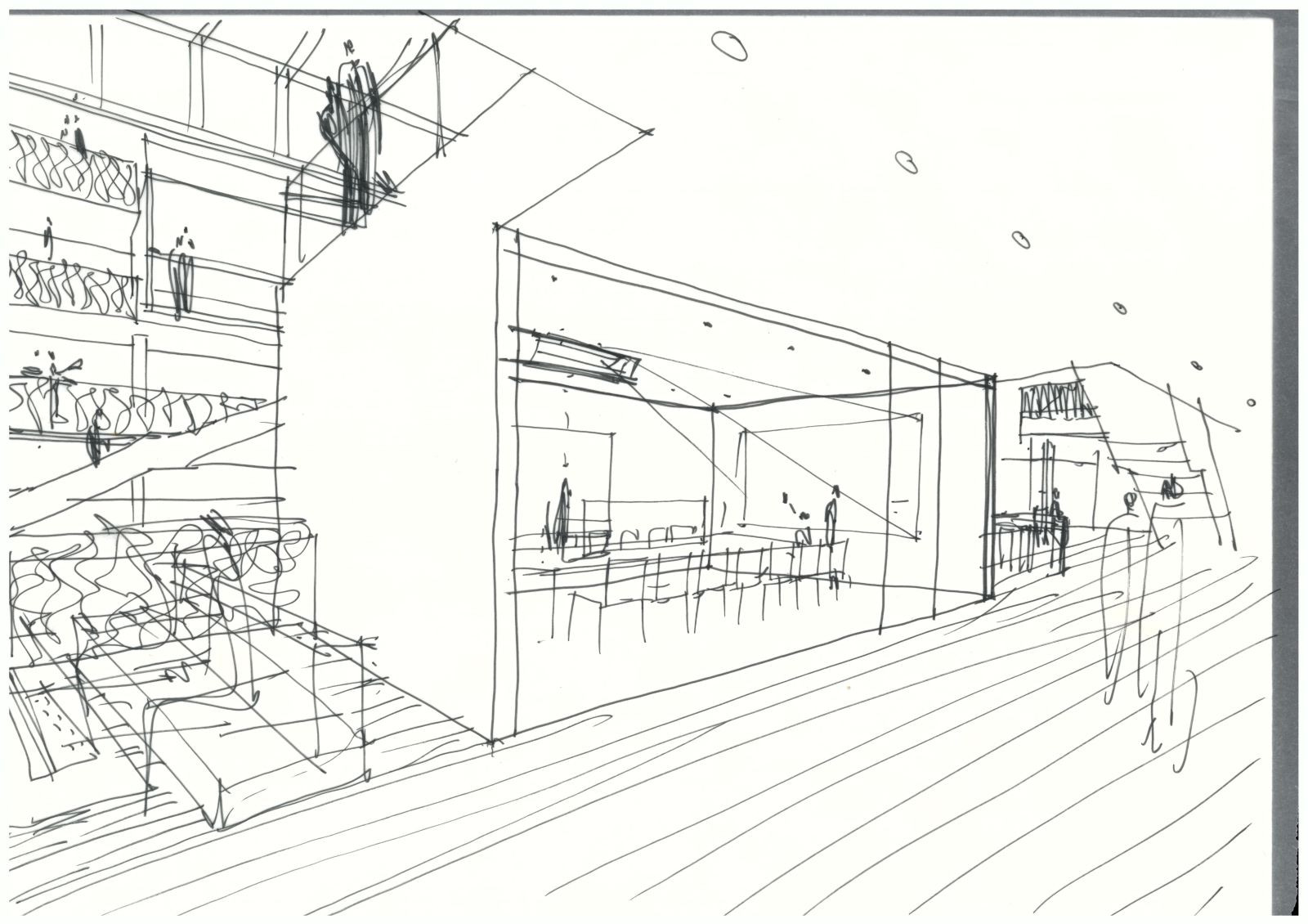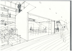 Zatímco v hlavním galerijním prostoru dominuje „oblak“ skic, instalace v předsálí jde myšlenkově ještě před jejich vznik: představuje typické zázemí, kavárnu, ateliér, knihkupectví či design shop. Pokud v někom výstava vzbudí si taky zakreslit, tady dostane vše co k tomu potřebuje.