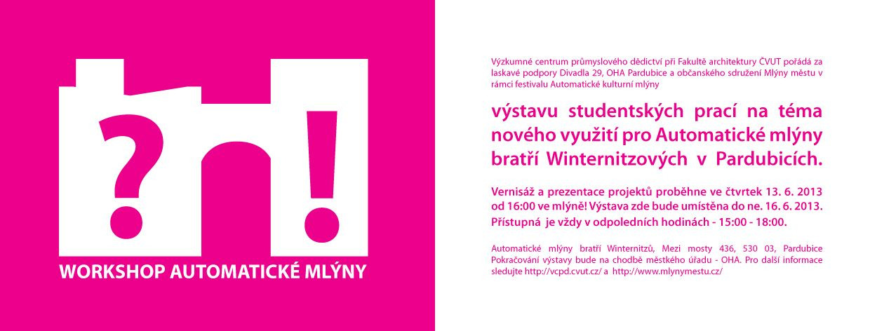 Výsledné práce vám nabízí k nahlédnutí následující výstava a přináší tak snad zajímavý pohled na možnosti budoucího vývoje tohoto jedinečného objektu. Výstava je pořádaná ve spolupráci s pardubickou iniciativou Mlýny městu! a Divadlem 29.
