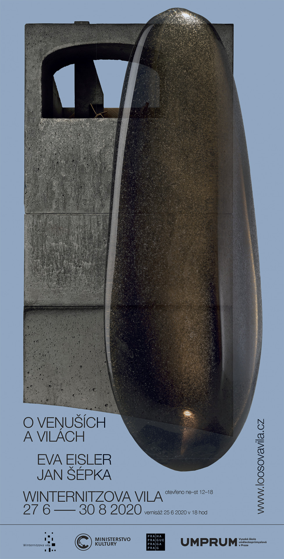 Architekt Jan Šépka a umělkyně Eva Eisler, profesoři Vysoké školy uměleckoprůmyslové se setkávají na výstavě ve Winternitzově vile. Jan Šépka vystavuje tři modely svých soukromých vil, Eva Eisler Venuše, sochy ženských torz z hutního skla. Společně vybízejí k úvaze nad krásou soukromého domu. V jejich podání to není pohodlí a prvoplánový luxus, ale svět, který své obyvatele povznáší a dává jejich životu umělecký rozměr. O což šlo ostatně i architektovi Winternitzovy vily Adolfu Loosovi, který poskytuje téhle výstavě nejlepší možné pozadí. Výstavu s názvem O Venuších a vilách je možné navštívit od 27.6. do 30.8. 2020.